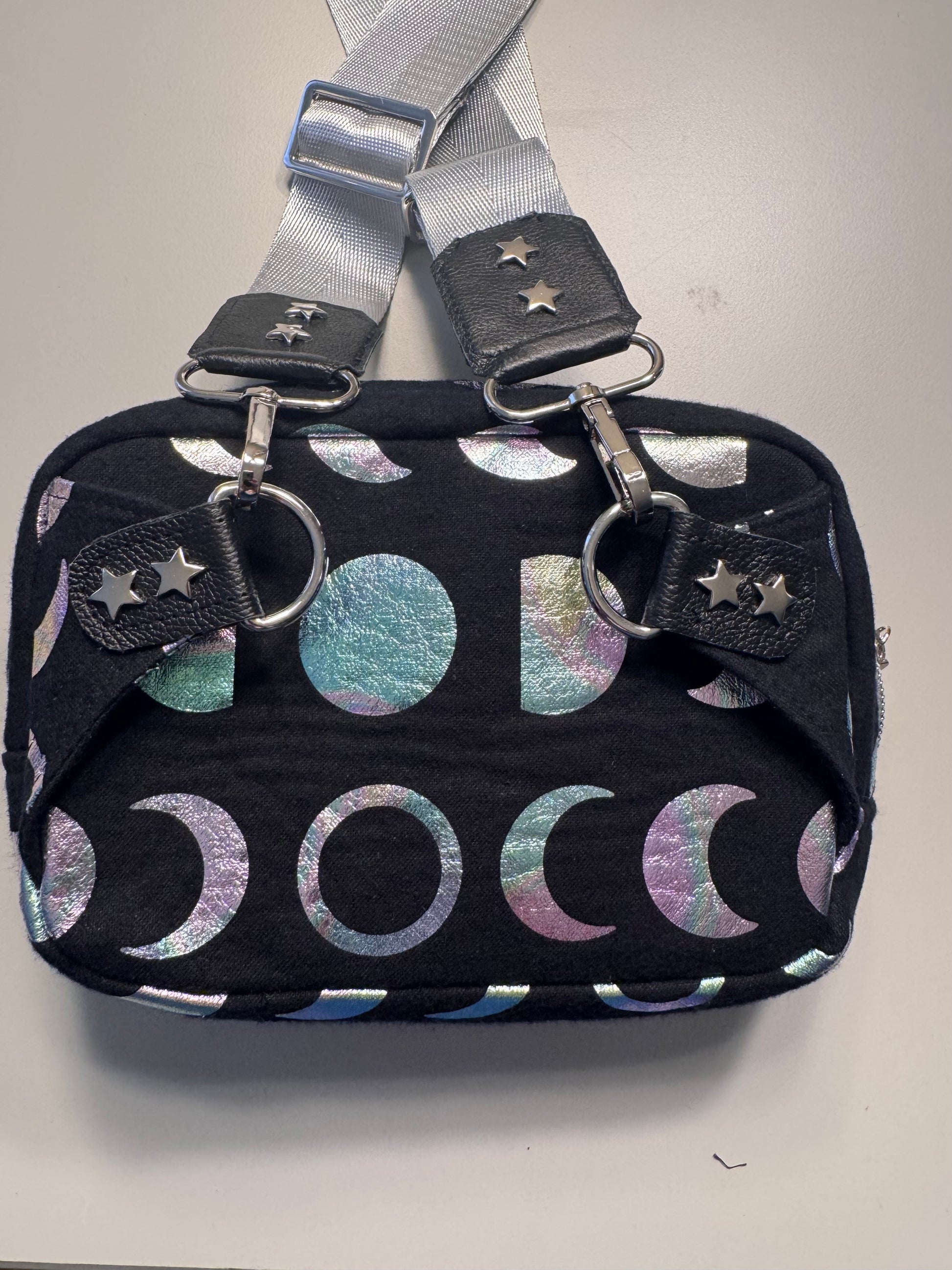 This versatile crossbody bag features a stylish moon and star design, perfect for any outfit. With a secure zipper pocket and double slip pocket, it offers ample storage for your essentials. Ideal for daily use or as a hip bag for hands-free convenience.