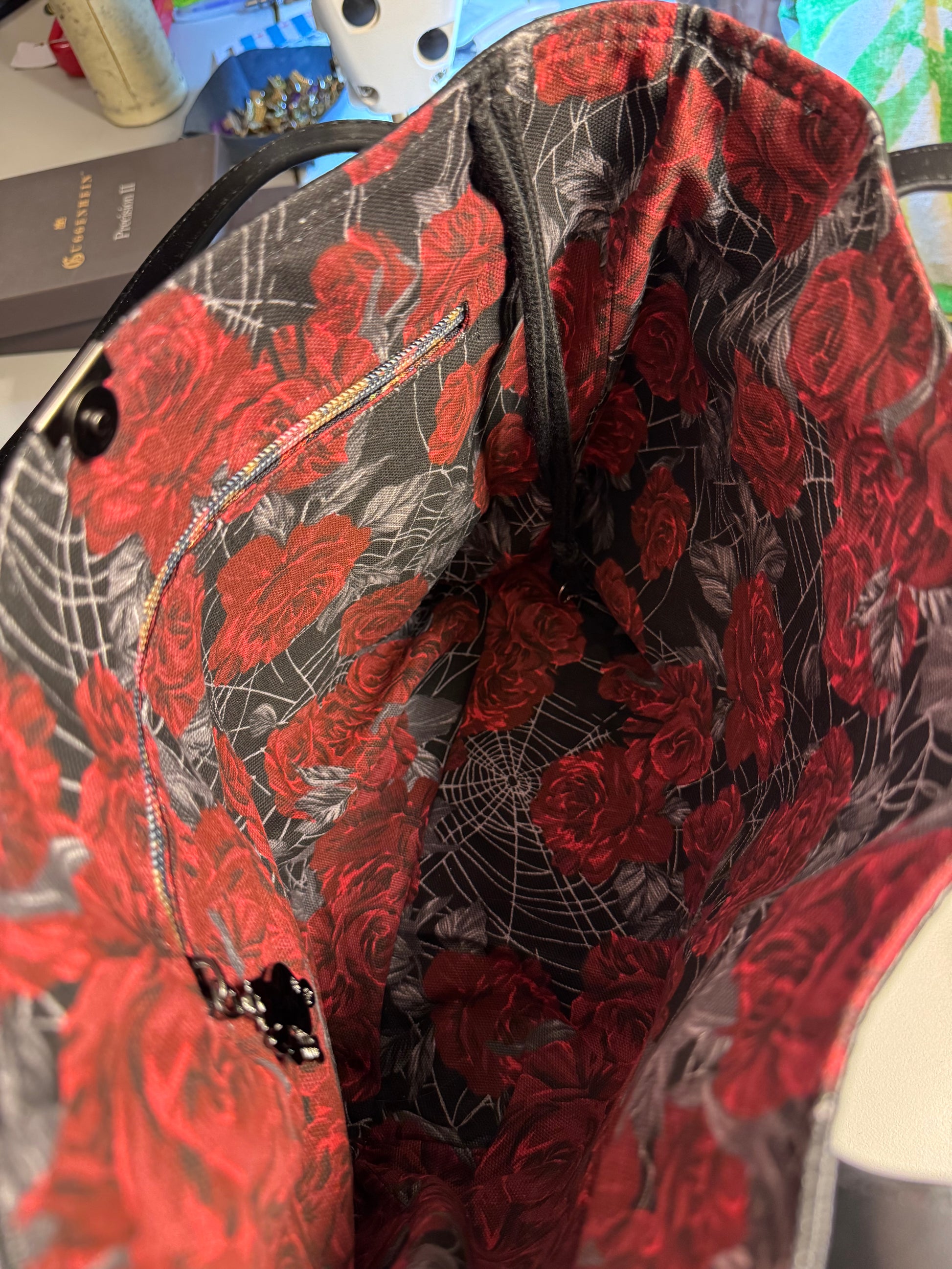 The Wolf tote is a stylish and practical accessory, featuring a faux leather wolf design on the front. Keep your essentials easily accessible with a double slip pocket on the back for your phone or keys. The fabric lining includes a zipper pocket and key strap, while the magnet snap closure keeps your items secure. Enjoy the perfect combination of form and function with this expertly crafted tote.